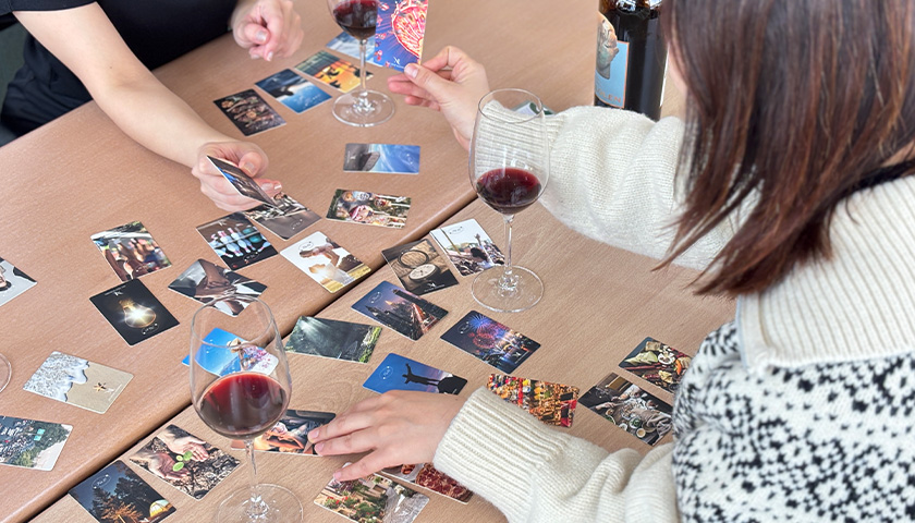 와인을 매개채로 한 감정 커뮤니케이션 시간 입니다. 블라인드로 와인 테이스팅한 후 자신이 느낀 감정을 카드로 골라 보며 팀원들과 이야기를 나누어 보는 소통 시간이에요. 와인 한잔씩 마시며 직장 내 커뮤니케이션을 원활하게 풀어보세요.