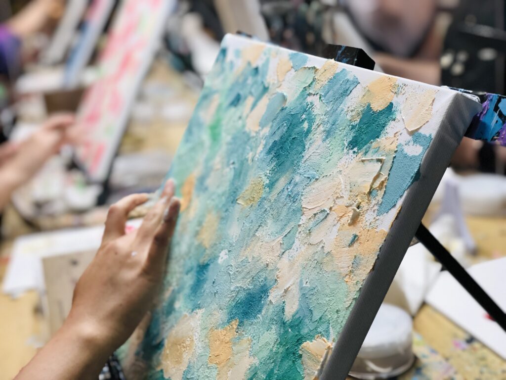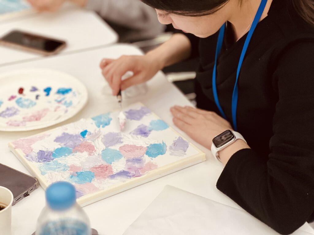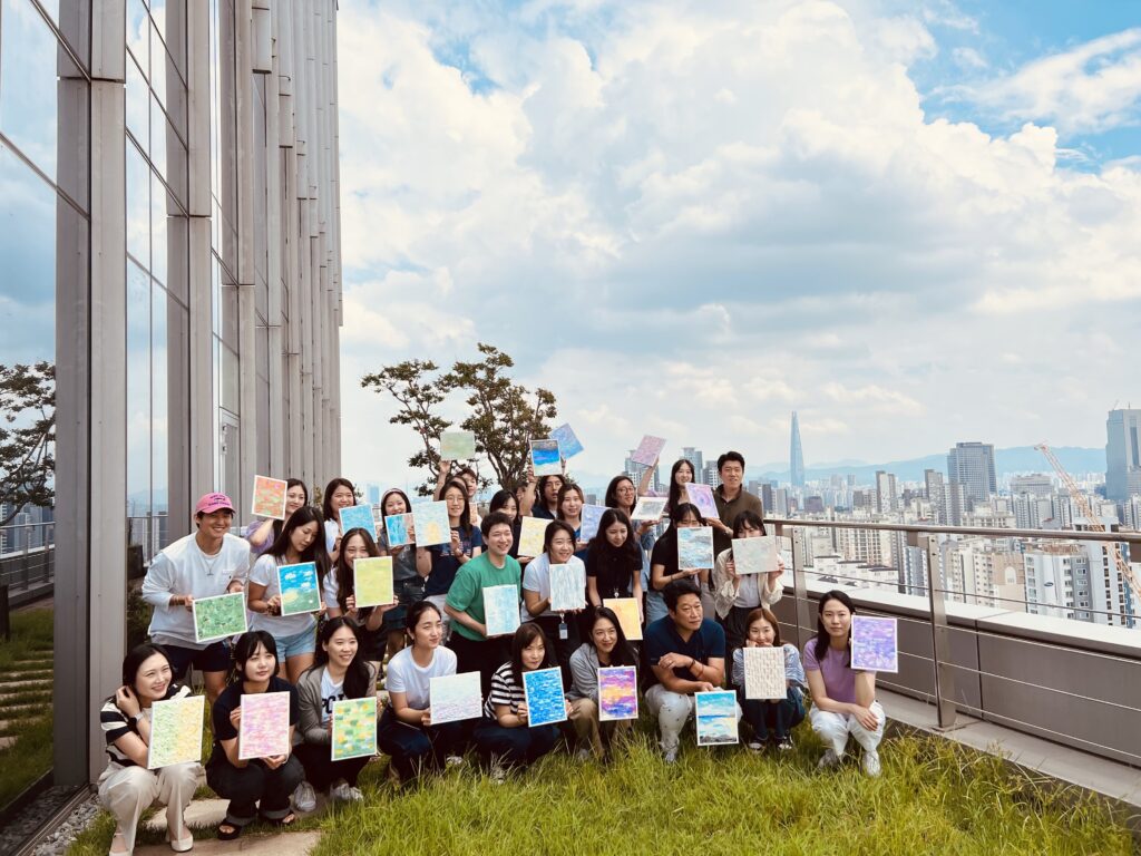 '백드롭 페인팅'은 틀에 얽매이지 않고 나이프를 이용해 자유롭게 페인팅하는 기법입니다. 각자의 개성을 살려 다양한 색채와 질감을 표현할 수 있어요. "나에게 가장 감탄을 준 순간."을 다시 떠올려 볼 거예요. 그 상황의 느낌을 구체적으로 꺼내 보며 그림으로 표현합니다. 입사 후의 과정이어도 좋고 한 해를 마무리하거나 새해를 시작하는 마음가짐을 표현해도 좋습니다. 신규 또는 경력 사원과 상관없이 진행이 가능하다는 게 큰 장점 입니다.