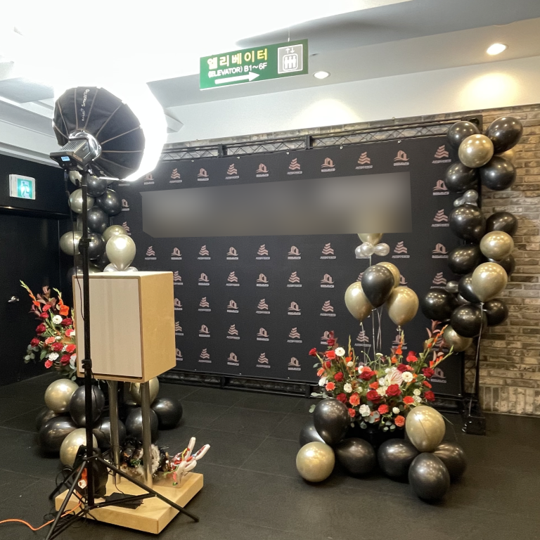 기업 맞춤 디자인 커스텀과 DSLR 촬영, 조명·소품·백월까지 완비된 포토부스입니다.