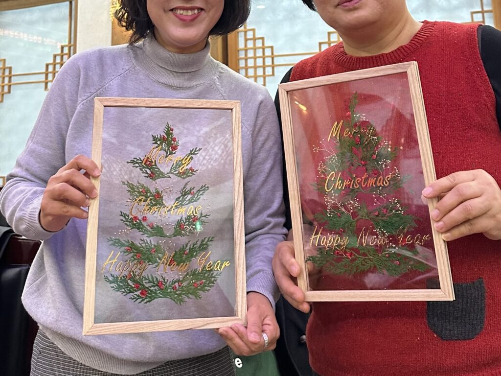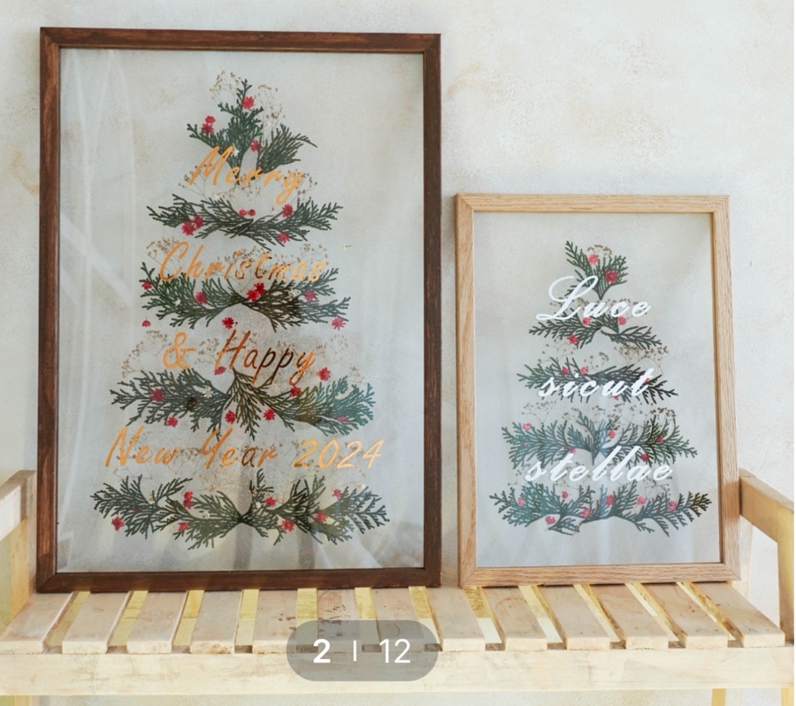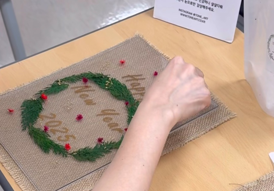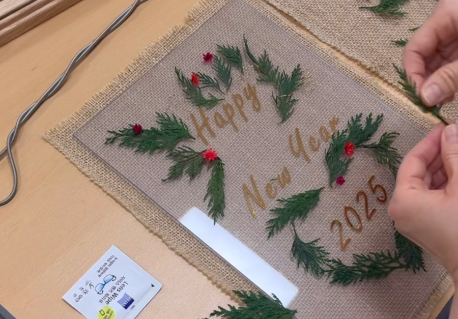 투명 아크릴과 우드 프레임 위에 골드빛으로 반짝이는 문구를 담고, 상큼한 편백 가지와 작은 꽃·식물소재를 얹어 나만의 트리 혹은 리스를 만듭니다. 우드 프레임은 밝은 웜톤으로 준비되며 다크톤은 재고 상황에 따라 진행 가능합니다.