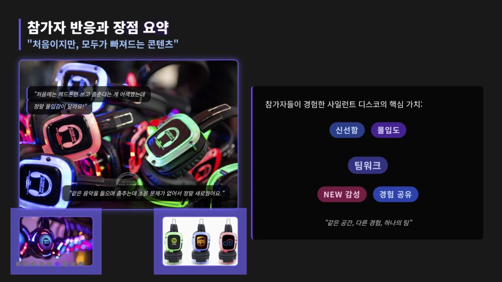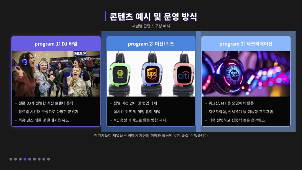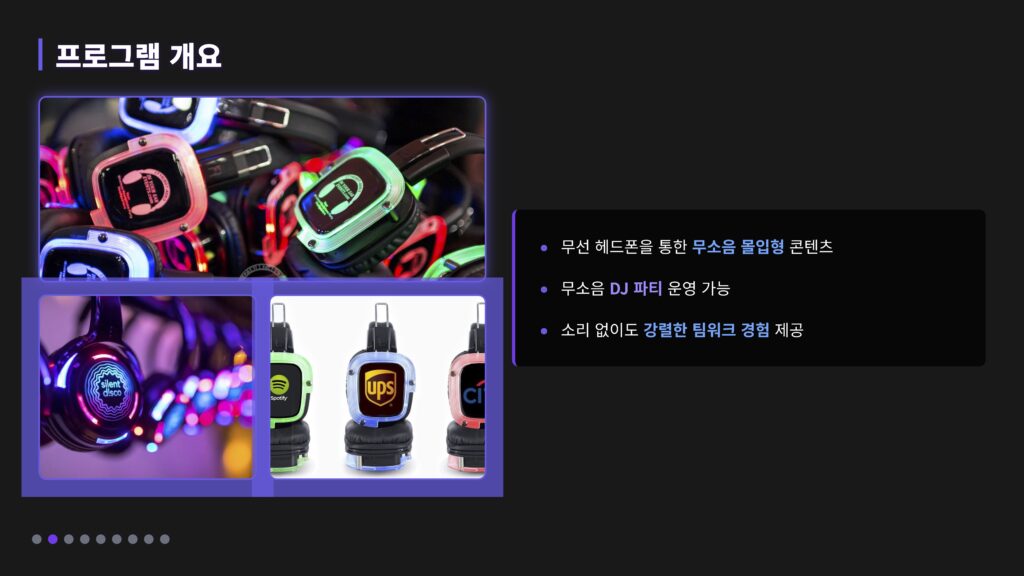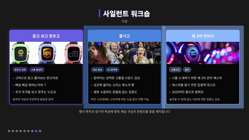 사일런트 워크숍은 무선 헤드폰을 착용하고 진행하는 무소음 몰입형 프로그램입니다. 소음 걱정 없이 실내·야외 어디서든 운영 가능하며, 다양한의 콘텐츠를 모두 진행할 수도 있어요. 음악, 힐링, 게임까지 무소음으로 즐기며 자율성과 몰입도를 극대화한 새로운 방식의 팀워크 콘텐츠! 이제는 조용해야 진짜 워크샵이 됩니다.참여자 모두가 헤드셋을 착용하고 즐기는 무소음 워크샵
