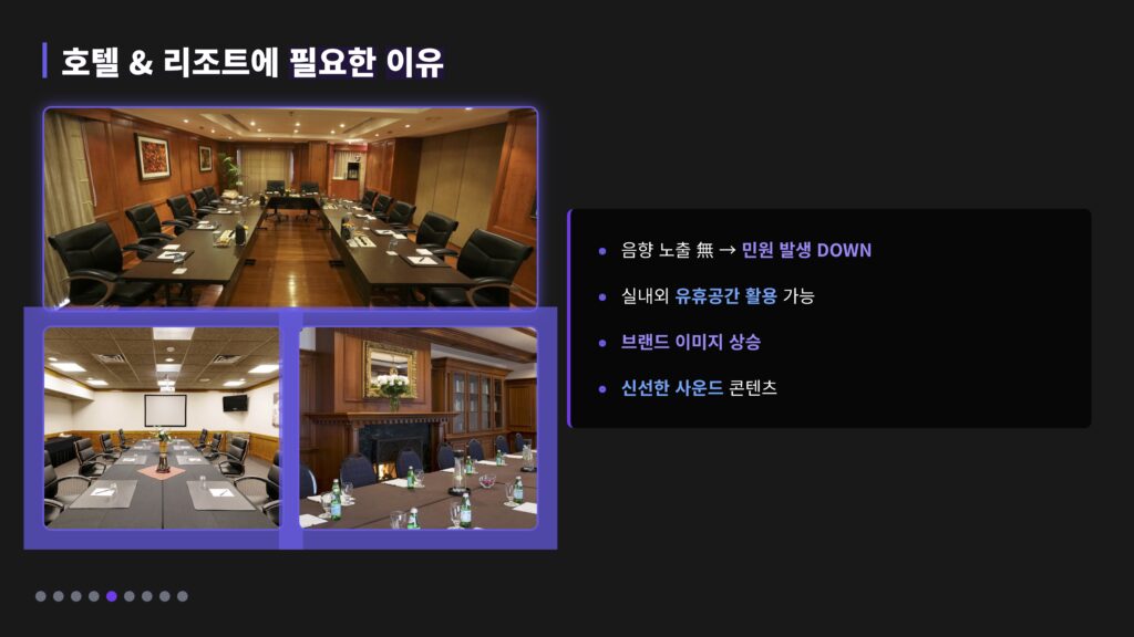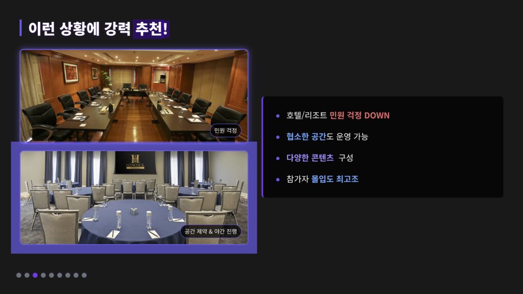 호텔, 리조트 등, 실/내외를 구분하지 않고 진행이 가능합니다.