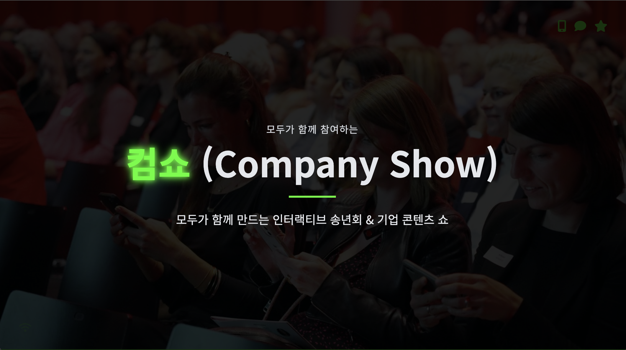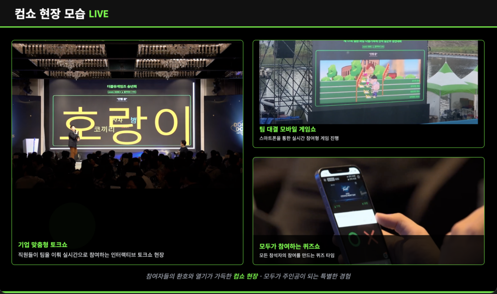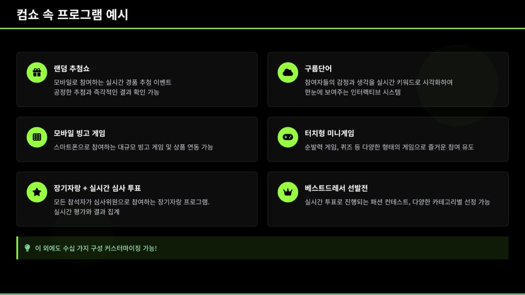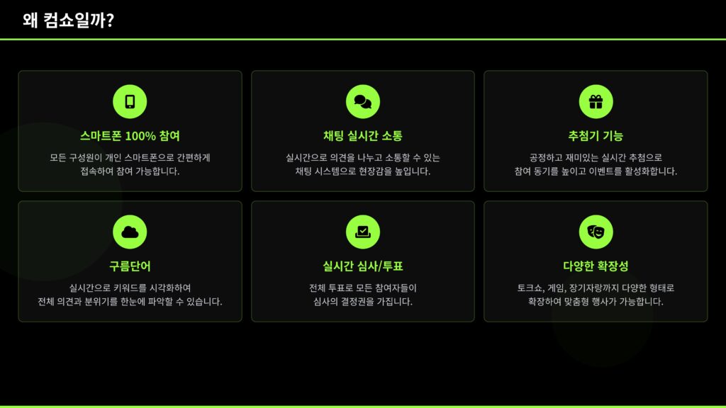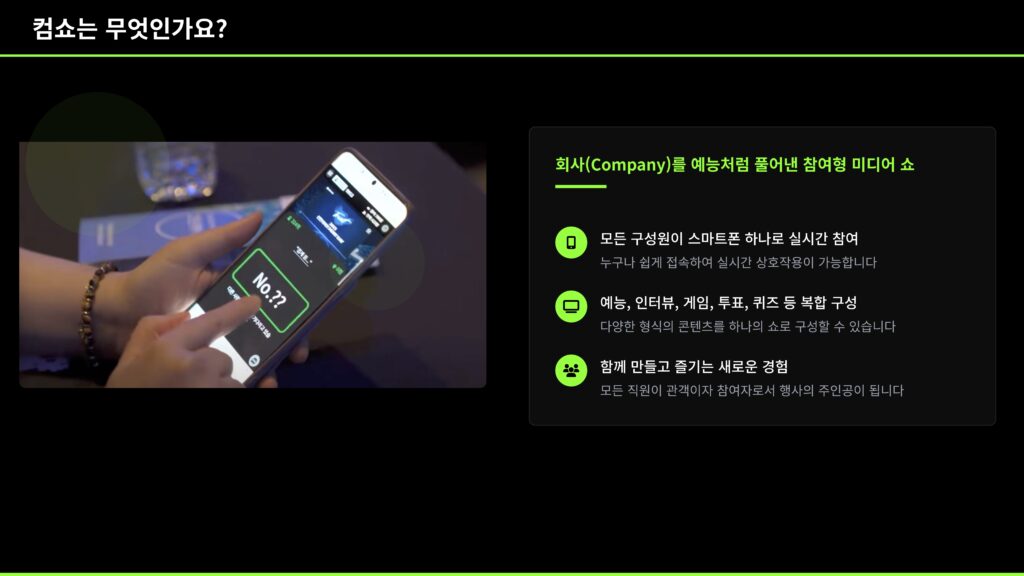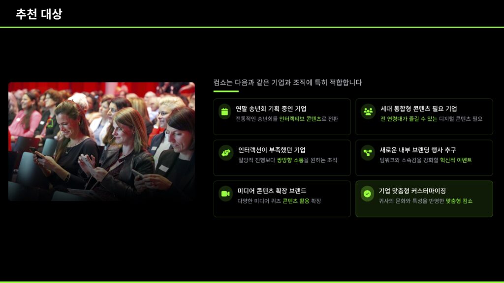 스마트폰 하나로 모두가 참여하는 컴쇼 송년회. 퀴즈쇼, 빙고, 실시간 투표, 장기자랑 심사까지 참가자가 관객이 아닌 진짜 주인공이 되는 송년회 콘텐츠입니다. 복잡한 장비 없이 웹 링크 접속만으로 즉시 참여 가능하고, 게임, 소통, 이벤트를 동시에 즐길 수 있어 지루할 틈이 없는 구성입니다. 송년회 분위기를 바꾸고 싶은 담당자라면 지금 바로 컴쇼 시스템 기반 송년회를 도입해보세요!모두가 참여하는 스마트 한 송년회