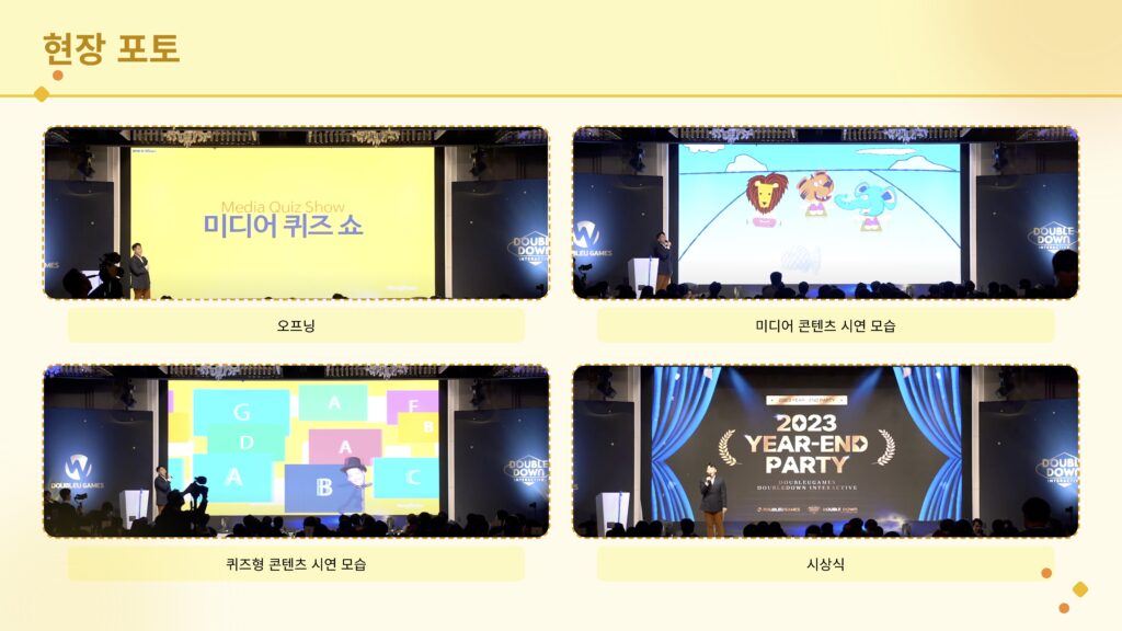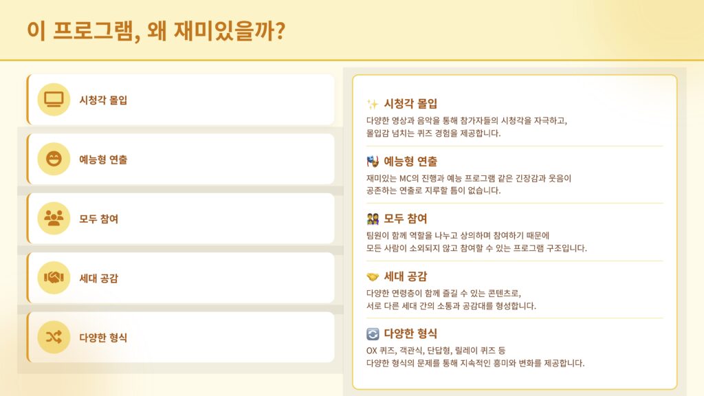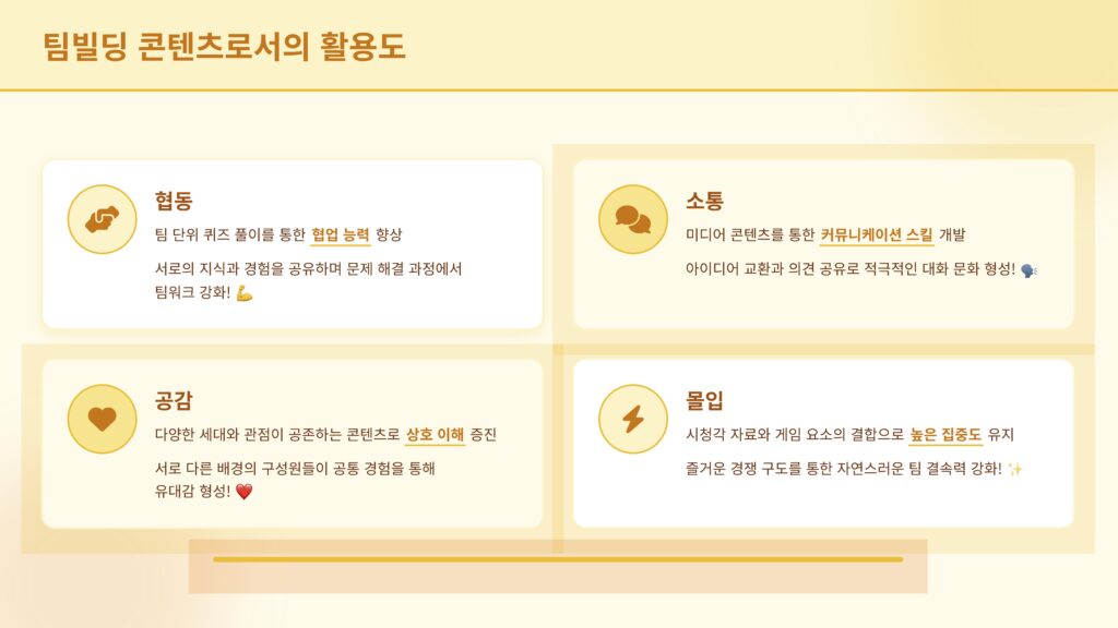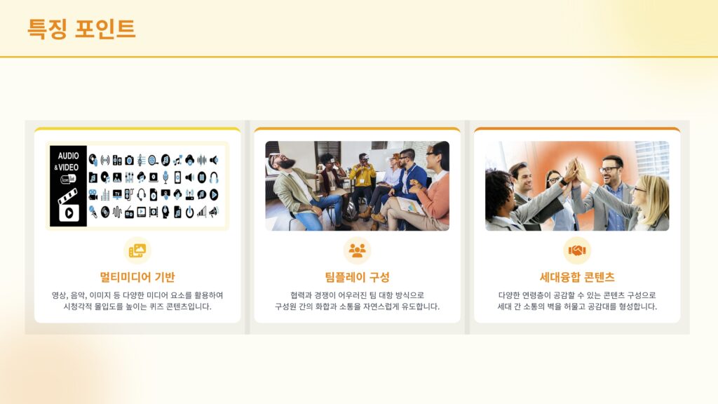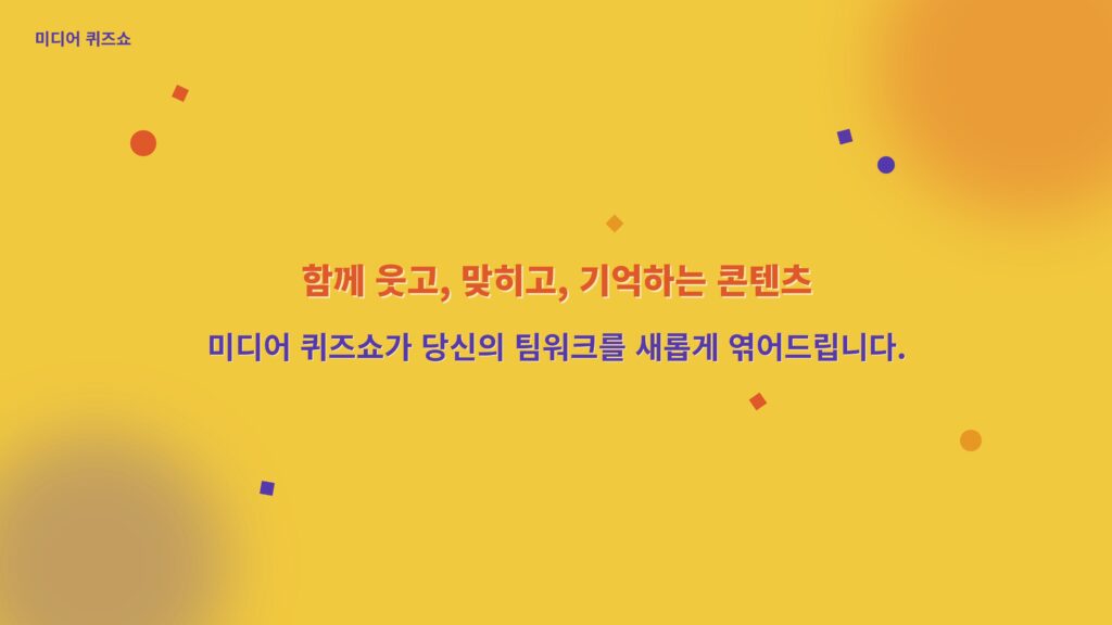 미디어 퀴즈쇼는 영상, 음악, 이미지 등 다양한 미디어 자료를 활용해 퀴즈를 풀며 팀 간 협력과 소통을 이끌어내는 팀빌딩형 프로그램입니다. 단순한 정답 맞히기를 넘어, 팀원들과의 의견 교환과 전략적 선택을 통해 자연스럽게 참여자 간 유대감을 형성합니다. 기업 맞춤형 콘텐츠 구성도 가능해 재미와 교육 효과를 동시에 누릴 수 있습니다.영상·음악 기반의 인터랙티브 퀴즈 대결!