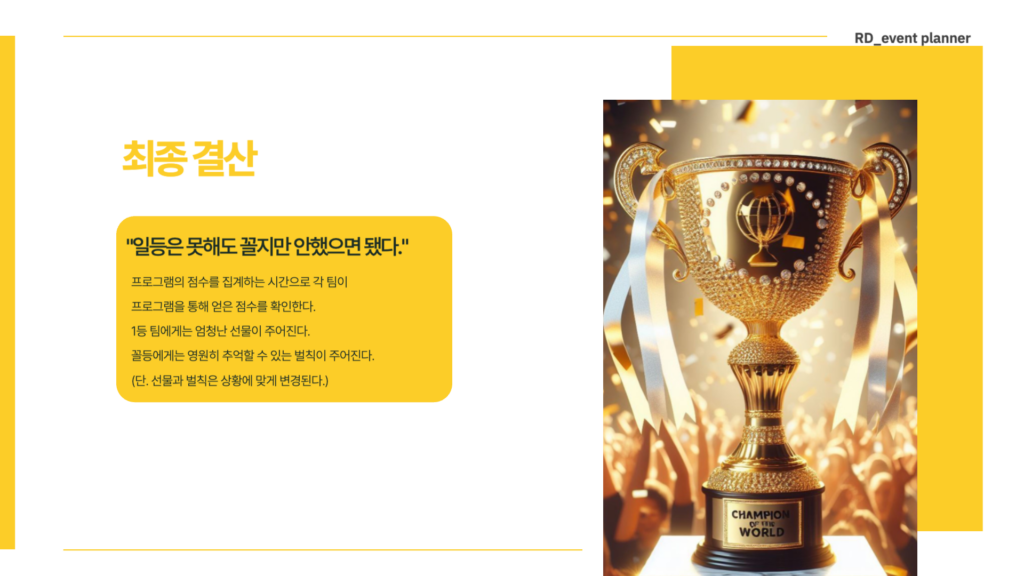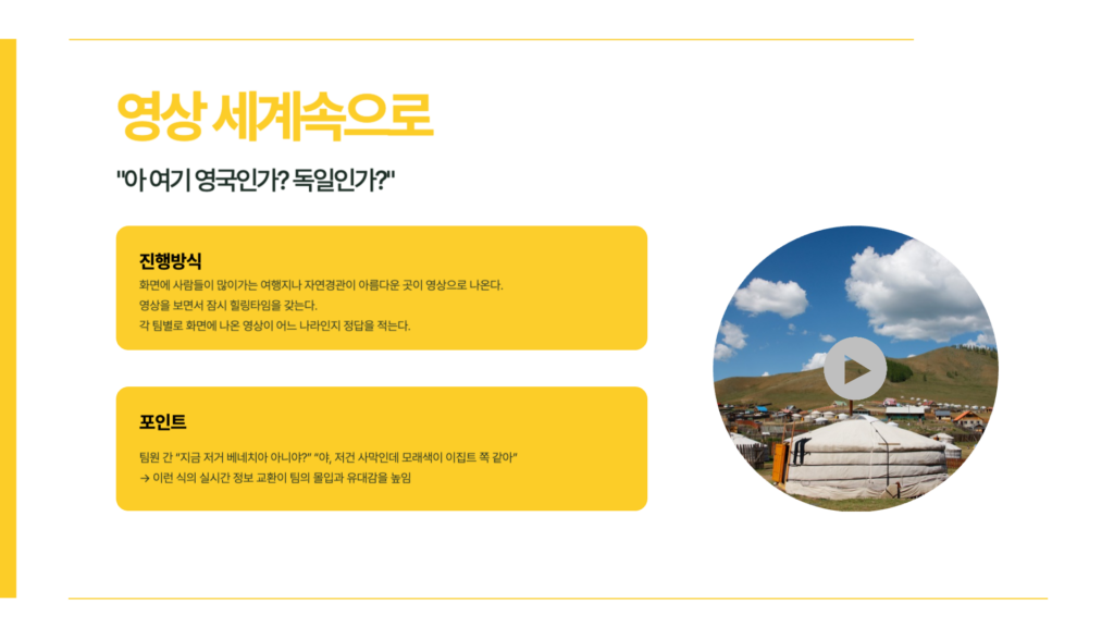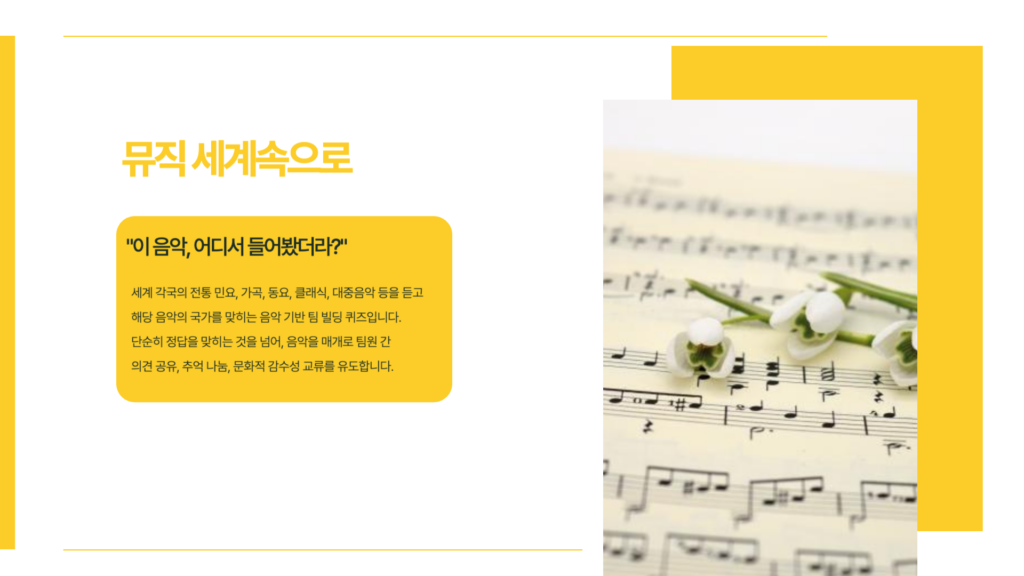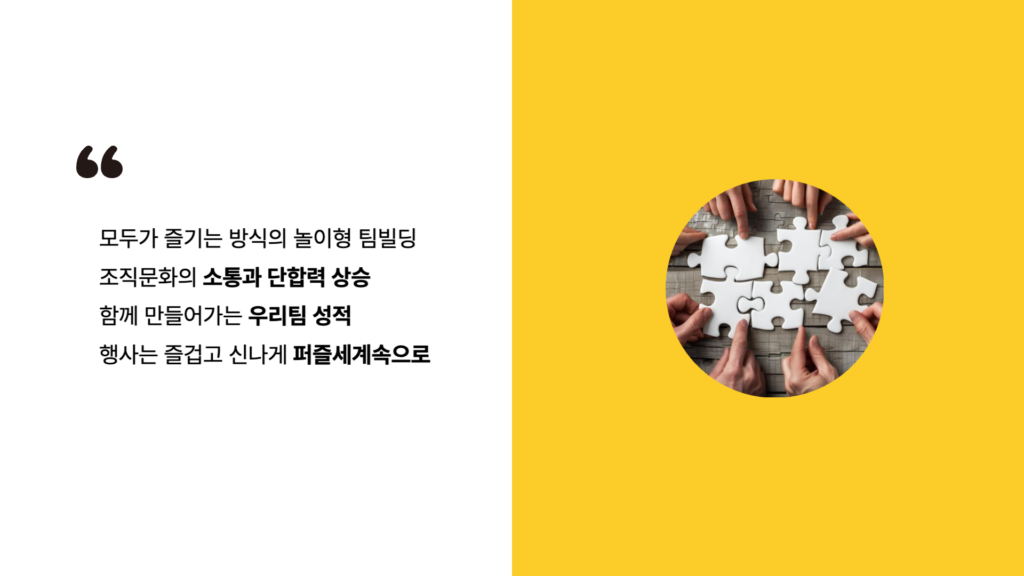 전세계 랜드마크를 테마로한 퍼즐이라는 목표를 위해 함께 만들어 가는 과정을 통한 화합과, 팀원 중 하나도 빠짐없이 함께 전세계의 문화, 특징, 음악 등 퀴즈를 풀어 나가며 협력을 하고, 그 안에서 소통과 친밀도를 높일 수 있는 프로그램으로 딱딱하고 재미없는 팀빌딩이 아닌 소통하고 재미있는 팀빌딩 프로그램입니다.퍼즐·음악·퀴즈가 결합된 예능형 팀빌딩 콘텐츠