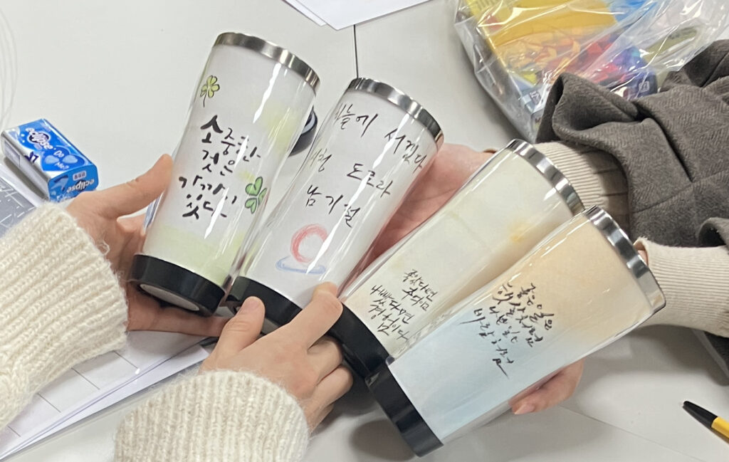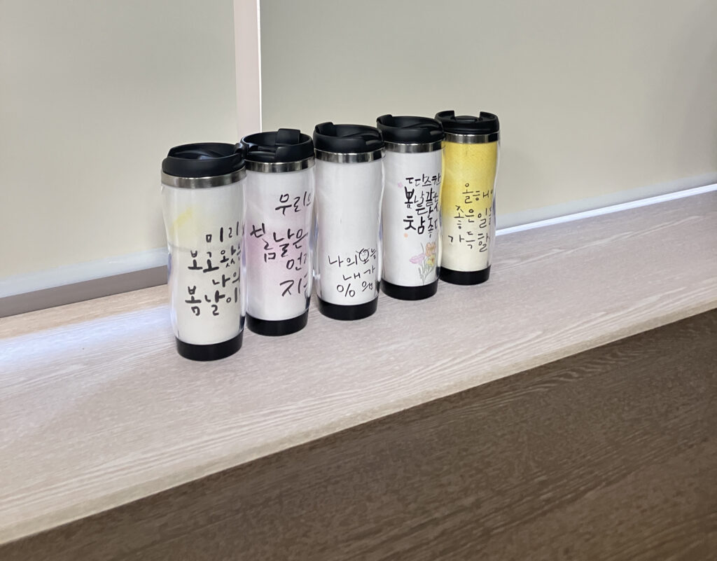저희 기관 신입직원들을 대상으로 한 프로그램을 찾다가 캘리그라피는 무언가 다짐을 쓰기도 좋고, 또 텀블러는 요즘 중요한 ESG의 의미도 있다보니 진행하게 되었습니다. 직원들이 직접 사용하는 것을 보니 뿌듯하고, 추천드리는 프로그램입니다.