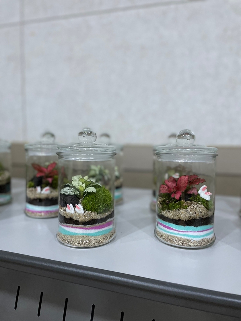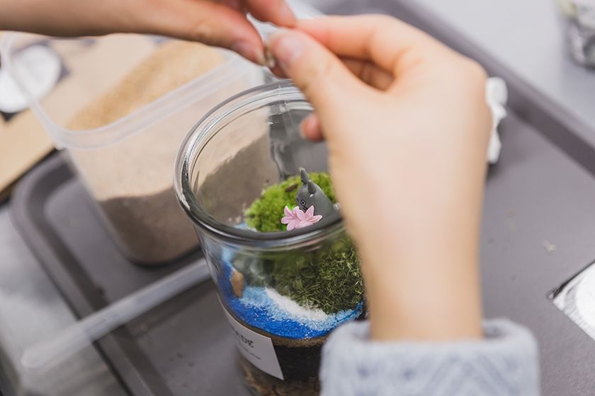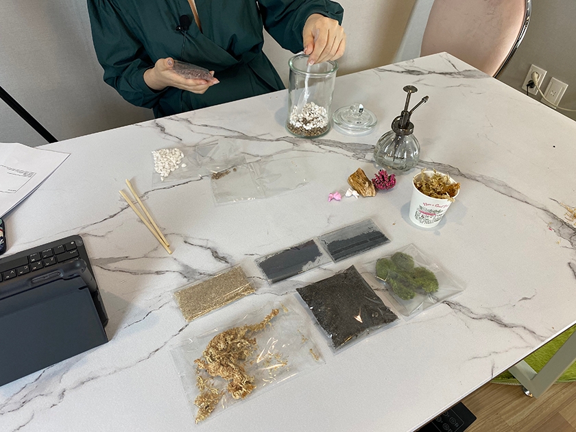 유리병,흙(배양토/마사토),모래(검은모래/금모래),자갈,이끼,수태,피규어,숯가루,쇼핑백(제공),핀셋(대여),숟가락(대여),가위(대여),테이블 비닐(대여)이 사용될 예정입니다.