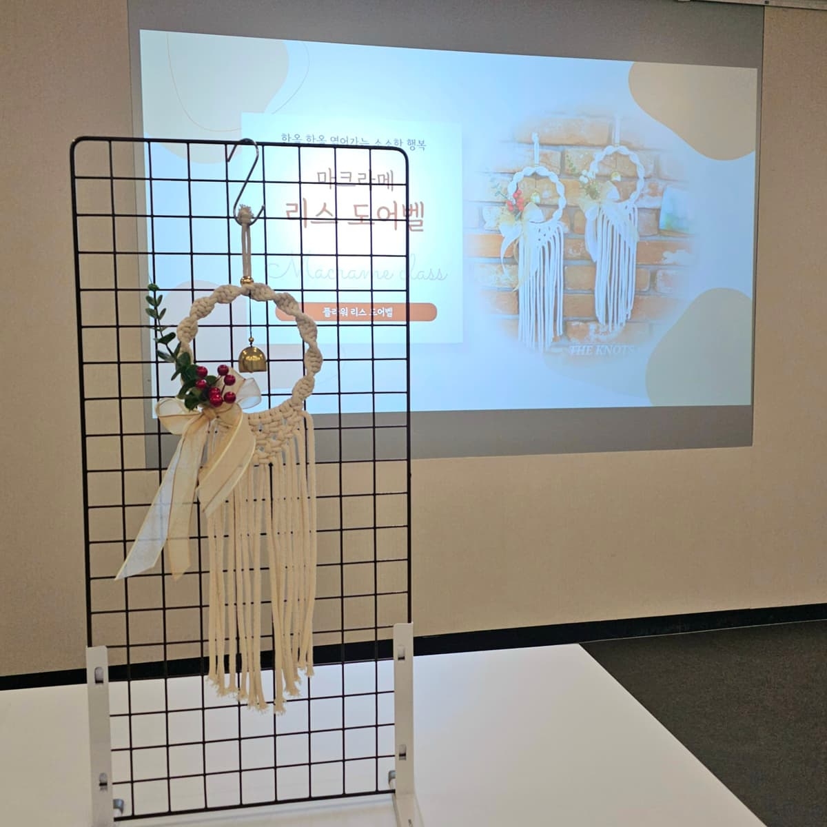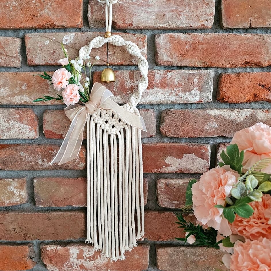 마크라메는 특별한 도구 없이 오직 손과 끈으로 매듭지어 작품을 만드는 공예에요. 손을 사용하는 공예여서 집중력 향상에 도움을 주고, 짧은 시간 안에 작품을 완성하기 때문에 성취감과 만족도가 매우 높답니다. 하나하나 매듭을 만들다 보면 머릿속의 복잡한 생각은 싹- 사라지고 오직 손끝에 집중하는 힐링 타임을 느껴보실 수 있을 거예요. 수업 시작 전 "제가 강사님 작품이랑 똑같이 만들 수 있을까요?"라고 많이 물어보세요. 제 대답은 늘 한결같답니다! "물론이에요, 저보다 더 예쁘게 만드실 수 있어요!" 그리고 결과는 당연히 모두 예쁘게 완성 : ) 플라워 리스 도어벨은 마크라메를 처음 해보시는 분들도 쉽고 재미있게 배우실 수 있고요, 예쁘게 완성하고 나면 자존감과 성취감이 쑥쑥 올라간답니다! 사무실 밋밋한 파티션이나 유리문 등 어느 곳에 걸어두셔도 예쁜 감성 인테리어가 완성! 지친 회사 생활에 마크라메 워크샵으로 감성 한 스푼 담아가세요.