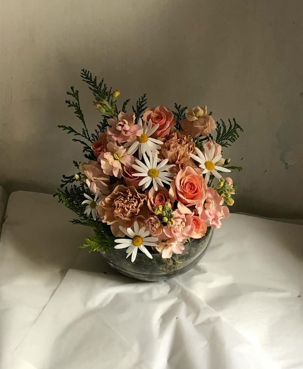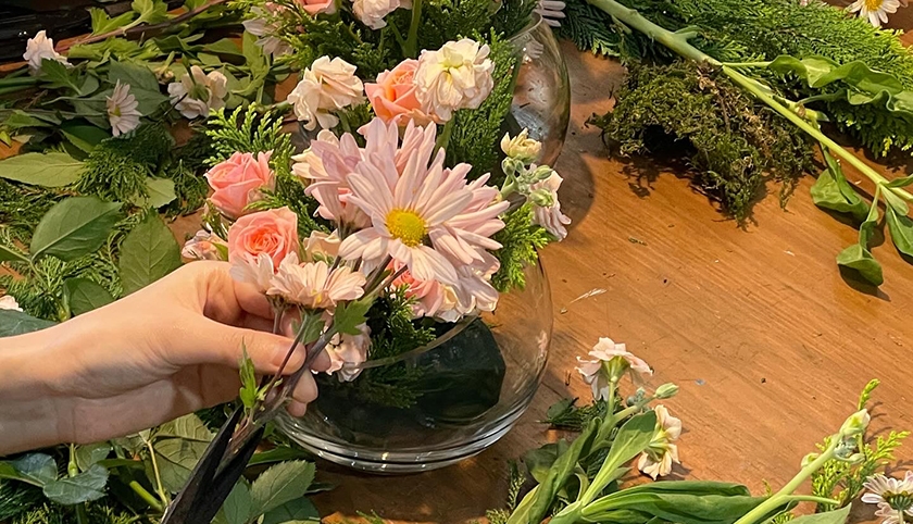 예쁜 반구형 유리볼에 예쁘고 싱그러운 꽃들을 담아 제작하는 플라워볼 센터피스 클래스입니다
