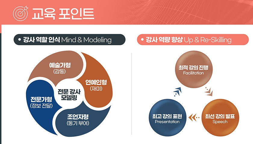 "누구나 강의를 할 수 있습니다." 자신의 지식과 기술을 전달하려는 마음이 있다면 충분히 가능합니다. "걸림돌을 넘어뜨리면 디딤돌이 됩니다." 다만, 그 길을 혼자 걸어가는 것은 생각보다 쉽지 않습니다. 하지만 선후배 동료, 코치 강사와 함께하면 한 걸음씩 다가설 수 있습니다. 동 교육 과정을 통해 강사로서 기본기를 갖춰보세요! 교육 방향 설정부터 스피치 실습, 교안 작성까지, 강사가 경험하는 전반적인 과정을 모두 아우르는 커리큘럼으로, 전반 커리큘럼은 강의 기획 및 구성, 진행 방법에 관한 교육입니다. 후반 커리큘럼은 스피치와 프레젠테이션 교육으로 핵심과 유용정보(Tip) 중심입니다. 학습자와 최적, 최상으로 상호 작용을 하는 강사로 함께 거듭나볼까요?