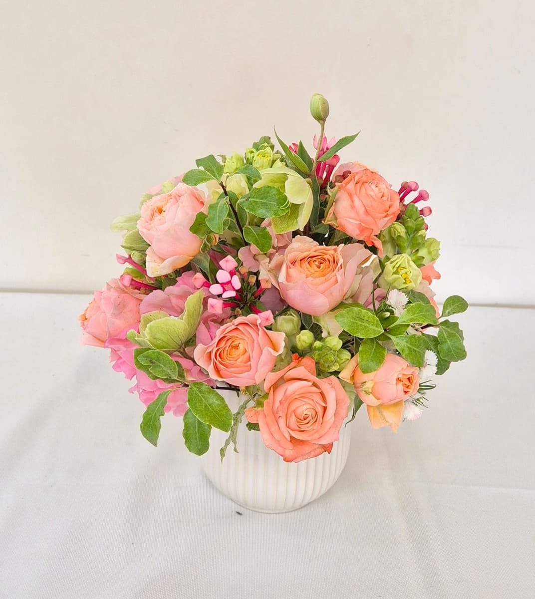 계절 생화를 활용해 직접 디자인하고, 테이블에 어울리는 입체적인 돔 형태의 테이블 꽃꽂이