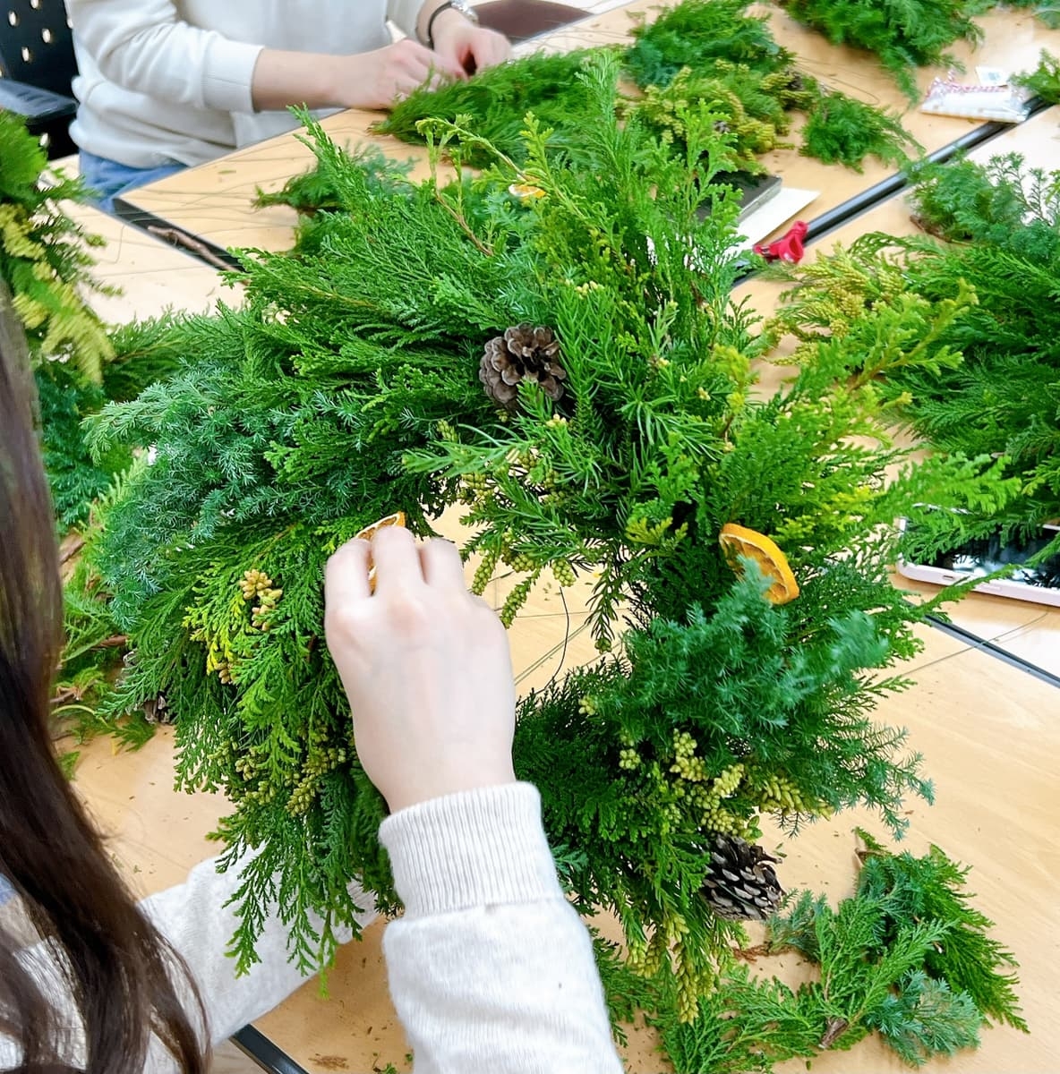 리스틀,크리스마스 소재(3~4가지,오너먼트(솔방울/말린 오렌지/시나몬스틱),철사,리본,opp,가위(대여)가 사용될 예정입니다.
