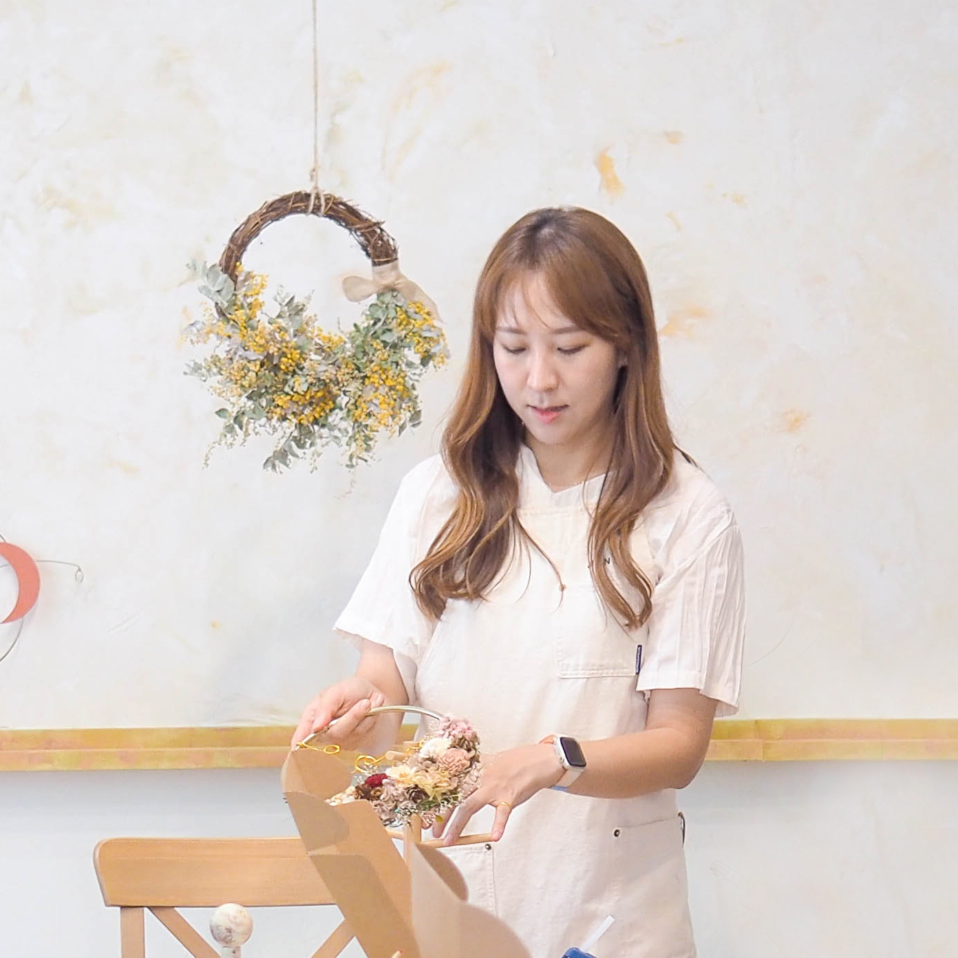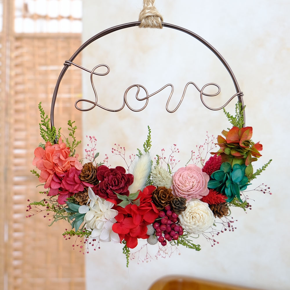 와이어 레터링(영문 7자 권장)을 더해 우리 팀, 나만의 레터링을 걸어요. 프리저브드는 ‘천일화’라 불릴 만큼 오래—약 1,000일 동안 형태와 색을 잘 간직해요. 컬러 팔레트는 크리스마스 콘셉트(그린·레드·골드)부터 브랜드 컬러 매칭까지 자유롭게 선택 구성합니다. 초보도 높은 완성도를 느끼며, 지름은 약 23cm. 레터링 문구는 D-7까지 취합해 주시면 사전 제작해 당일엔 꽃 작업에만 몰입할 수 있어요. 브라운 색상 와이어 기본 컨셉 골드변경 가능(옵션선택 추가금 발생).
