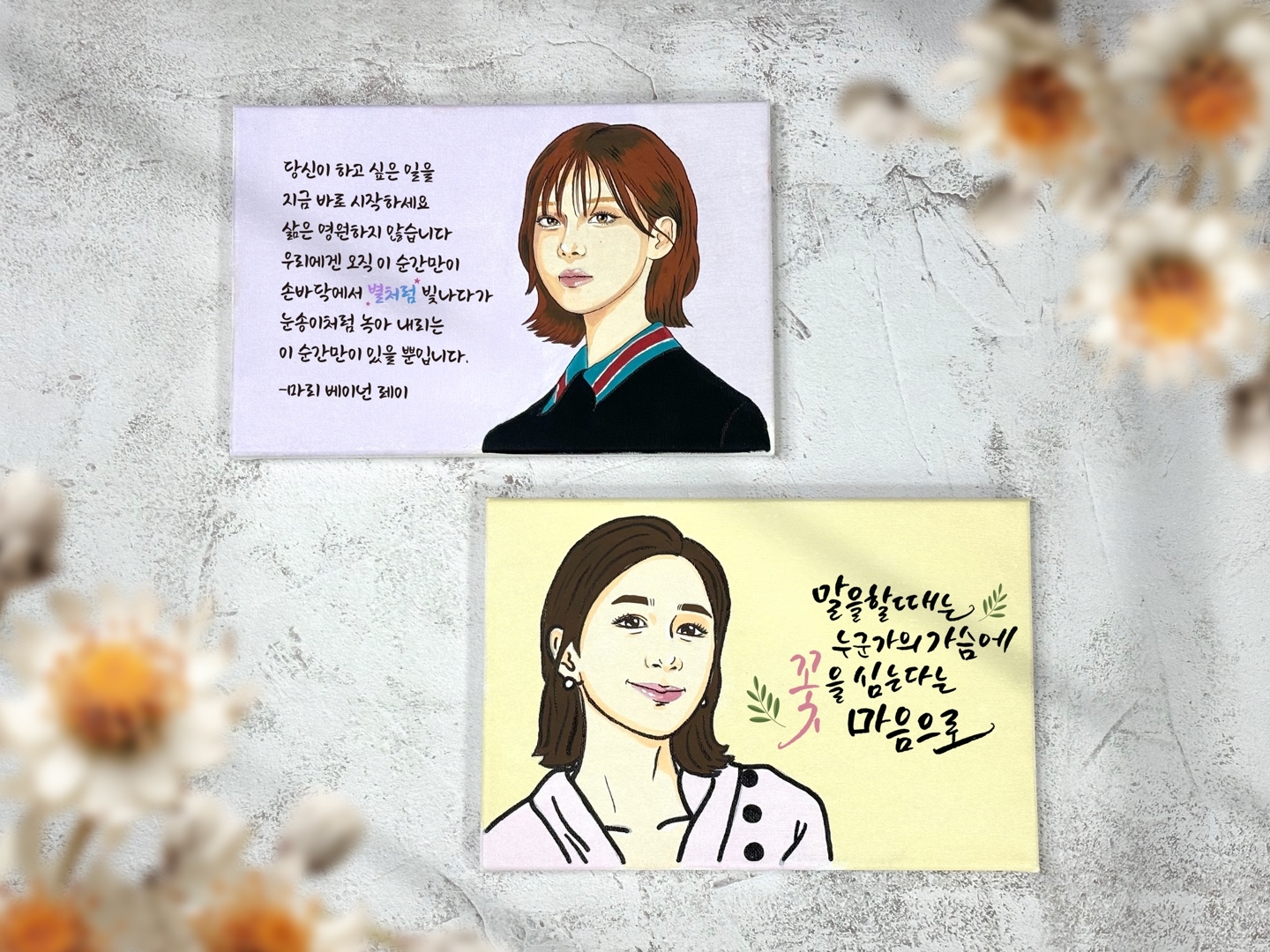 팝아트 기법을 이용하여 나의 자화상을 그려보고 앞으로 회사 생활에서의 다짐이나, 나에게 힘이 되는 문구를 캘리그라피로 작성하는 알찬 프로그램입니다. 비전 교육뿐만 아니라 힐링 프로그램, 신입사원 교육으로 추천 드리며 자신의 목표와 메시지, 상징적인 이미지를 자유롭게 그리고 다양한 색을 채워 넣어 나만의 작품으로 완성합니다. 클래스 사전에 보내주신 사진들로 팝아트 및 작업 라인이 완료되어, 참가자분들은 수업 시작 순간부터 캔버스 위 아름답게 담긴 나를 마주하며 힐링이 시작됩니다. 클래스는 모임 주제에 맞춰 비전, 성장, 힐링 등에 접목한 수업으로 유의미한 시간을 만들어 드리며 자연스럽게 자신의 생각과 비전을 표현하고, 완성된 작품을 팀원들과 공유하며 서로의 이야기를 듣는 시간을 통해 편안한 소통의 장이 만들어집니다. 누구나 캘리그라퍼로 살아가게 되는 전문 강의와 더불어 오랜만에 물감을 다루고 그림을 완성해 가며 아트 테라피를 받는 유익한 시간! 완성된 작품은 개인의 목표와 메시지를 담은 기념품으로 일상 속 워크숍의 의미를 다시 떠올릴 수 있는 특별한 결과물입니다.