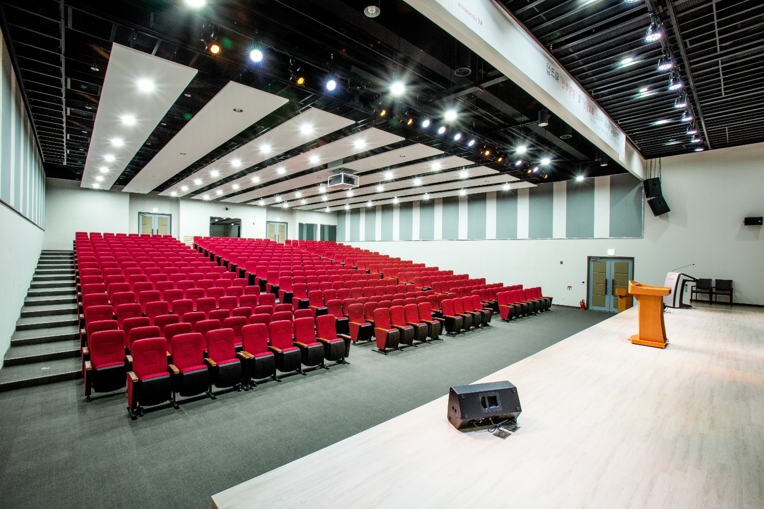 · 1개실 · 레이저프로젝터 · 전자교탁/무선 핸드마이크 · 전동스크린/현수막 · 강의용 핀조명 · 국제행사용 동시통역실 ※ 최소 이용금액 기준