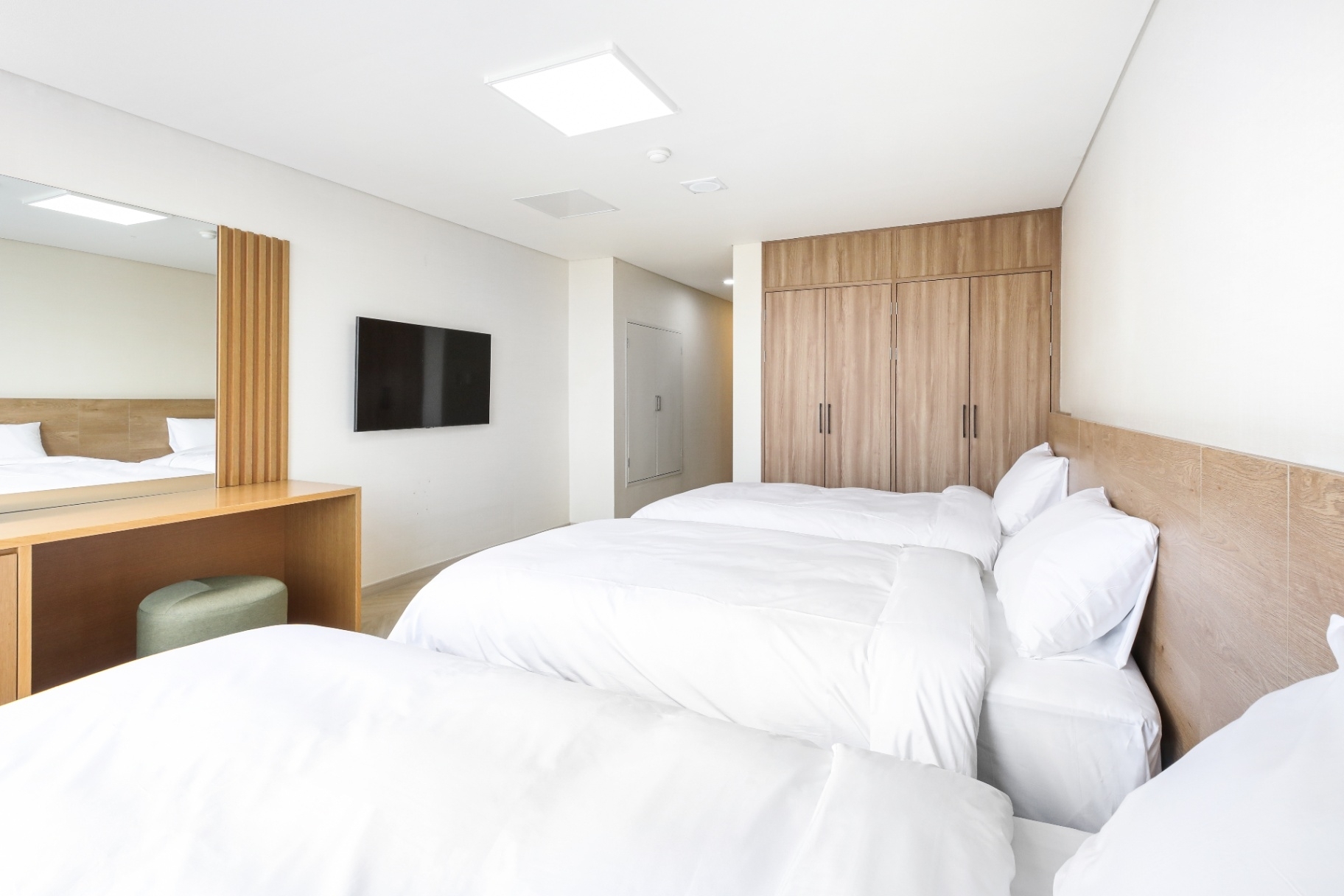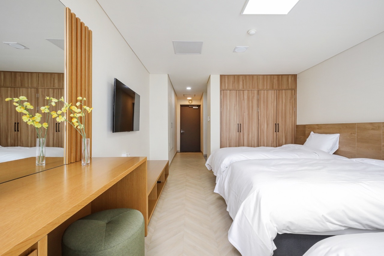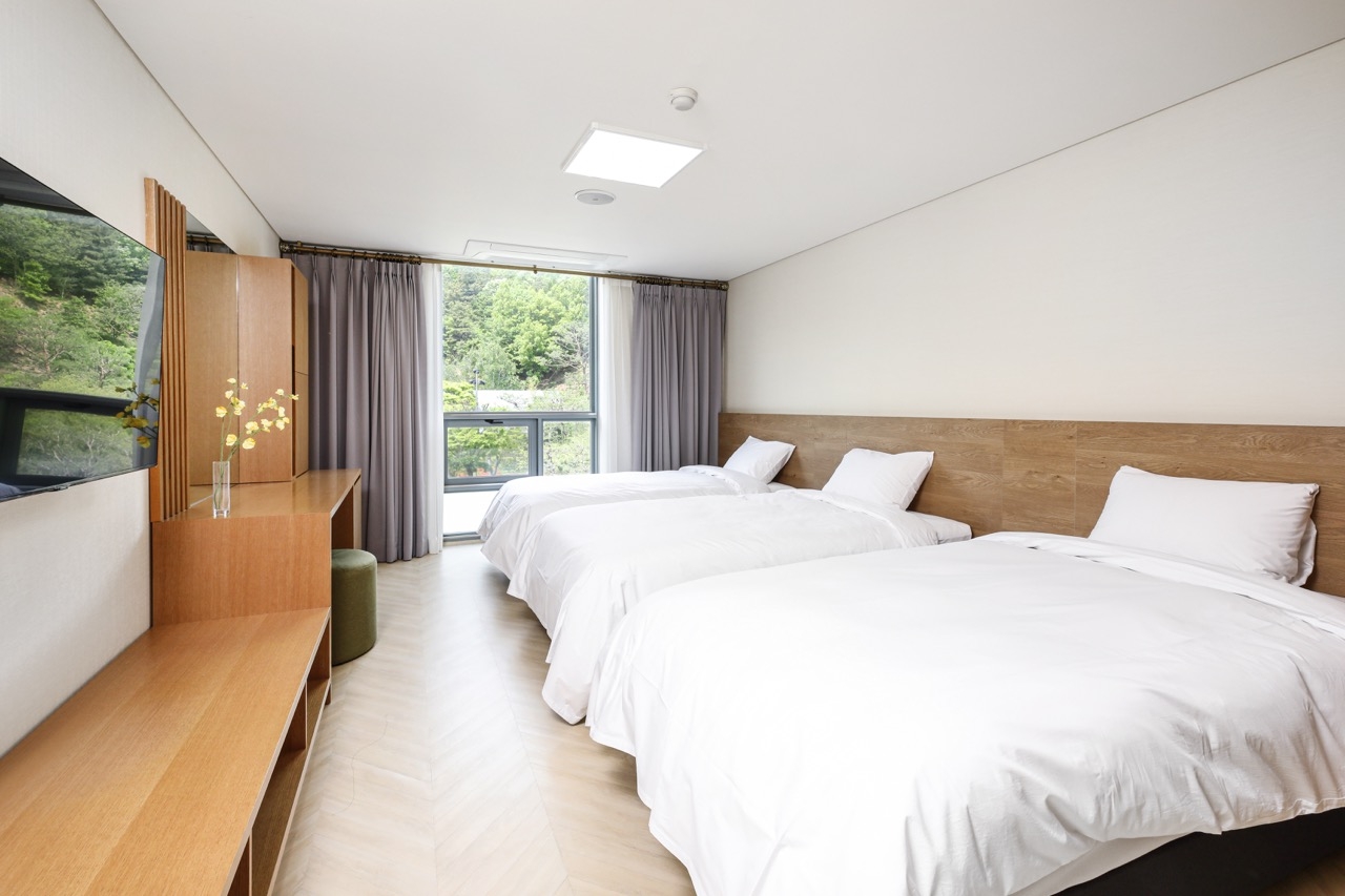 [객실 정보] - 구성: 싱글베드 3개 - 객실 수: 총 48실 [이용 인원] - 객실 기준 인원: 3명 - 총 수용 인원: 144명 *인원추가: 가능(사전 협의 필수)